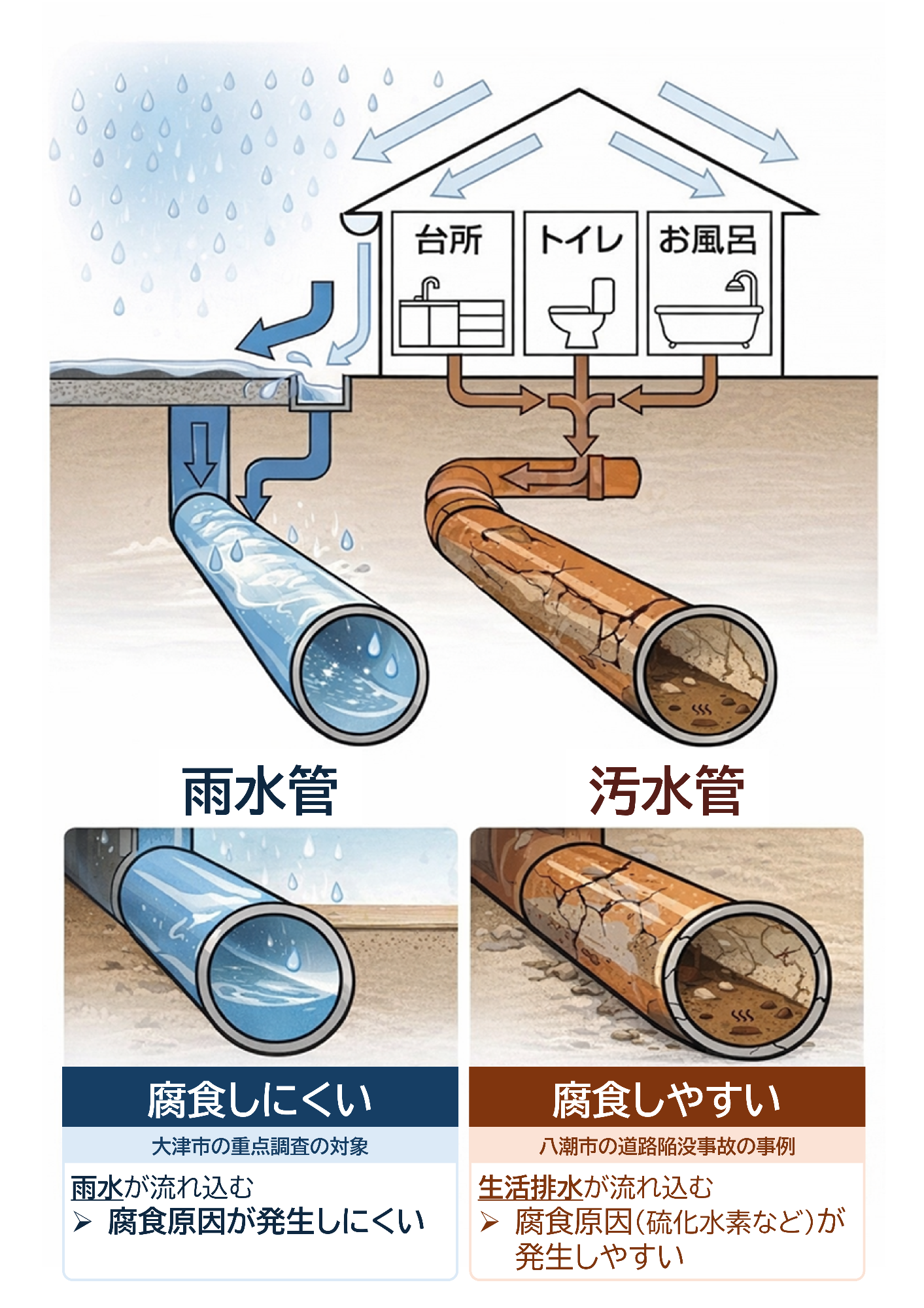一方、雨水管は雨水を流すための管路であり、通常はコンクリートを腐食させるような環境が生じにくいとされています。