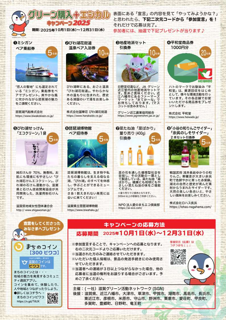 エシカル消費を含めた持続可能な滋賀県発の新しい消費行動を日々の生活に定着させることを目的に、(一社)滋賀グリーン活動ネットワーク主催の「グリーン購入+エシカルキャンペーン」が令和7年10月1日(水曜)から12月31日(水曜)までの期間に開催されています。