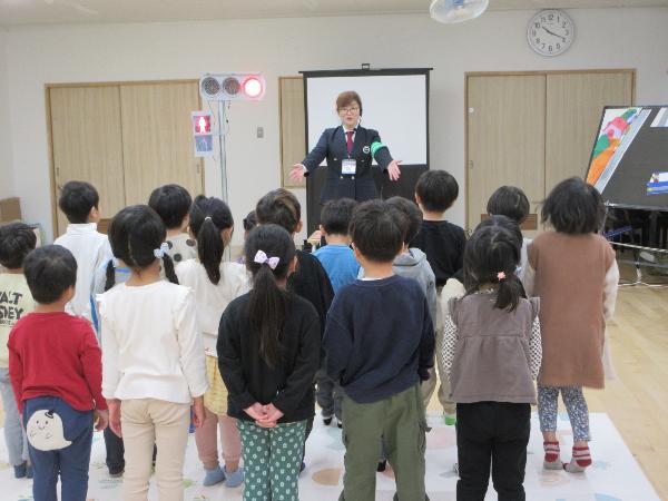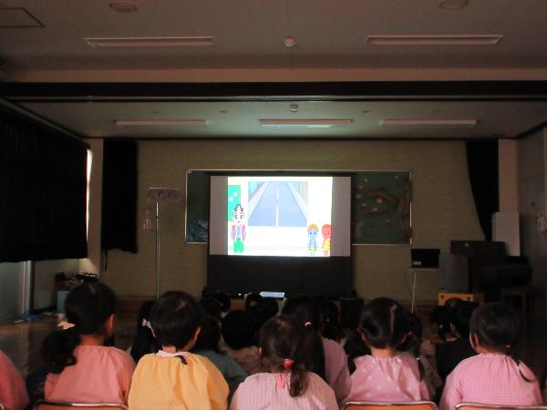 パネル絵やDVD鑑賞で交通ルールを学びました。信号の約束や、道路の歩き方、飛び出しの危険、道路で遊ばないことなどを学びました。そして、実際に園の周辺道路で歩く練習をしました。交差点や駐車場から車やバイク自転車などが出てこないか、周りの安全をしっかり確認して歩く事ができました。