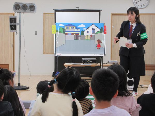室内でパネル絵を見て勉強した後に、DVDを観たり歩行訓練を行いました。年長児は、園周辺を歩き住宅街の路地では、その都度周りの安全を確かめることができました。