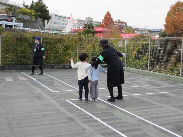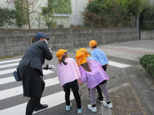 パネル絵やDVD鑑賞をして交通ルールを学びました。また、保護者向けの交通安全教室を行いました。園庭に作った模擬道路では保護者の方と手をつなぎ、歩行訓練をしました。降園時には門から道路に飛び出さず、保護者と手をつなぎ、しっかり止まって安全確認を行いました。