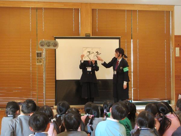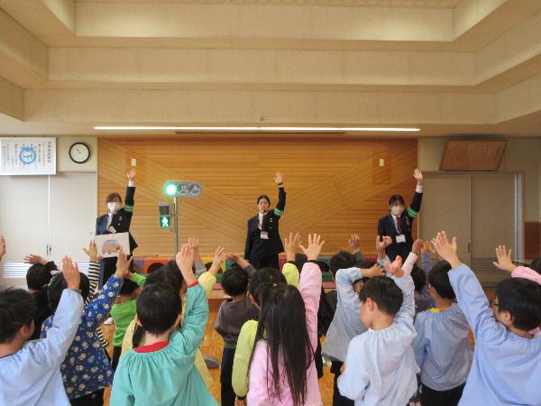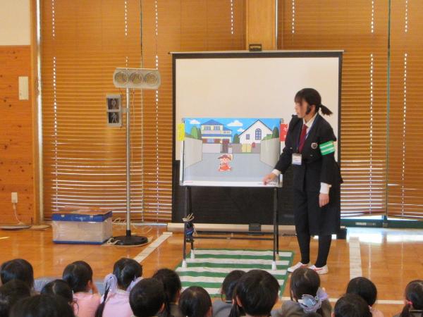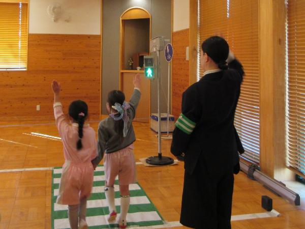 パネル絵やDVD鑑賞で、信号の約束や、道路の歩き方、横断歩道の渡り方などを学びました。そして、ホールに模擬道路を作り、実際に歩いて練習しました。横断歩道を渡る時だけではなく、信号がない交差点を渡る時にも、しっかり顔を動かして右・左・右の安全確認を行う事ができました。