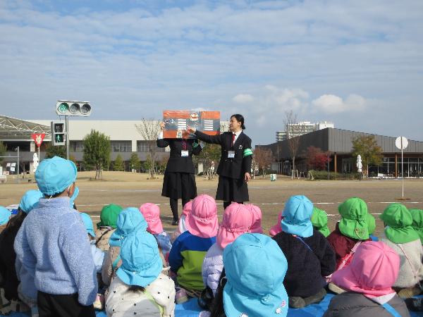 大津市では、保育園や幼稚園等に出向き、幼児とその保護者等を対象として「交通安全カンガルー教室」を開催し、パネル絵やDVD鑑賞等を通して交通安全教育を行っています。