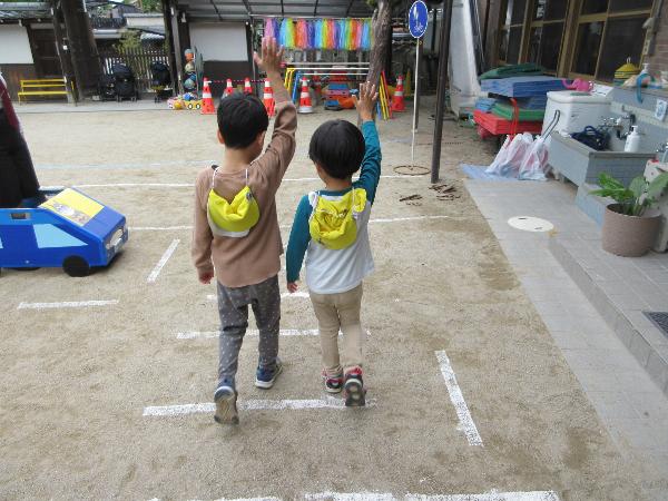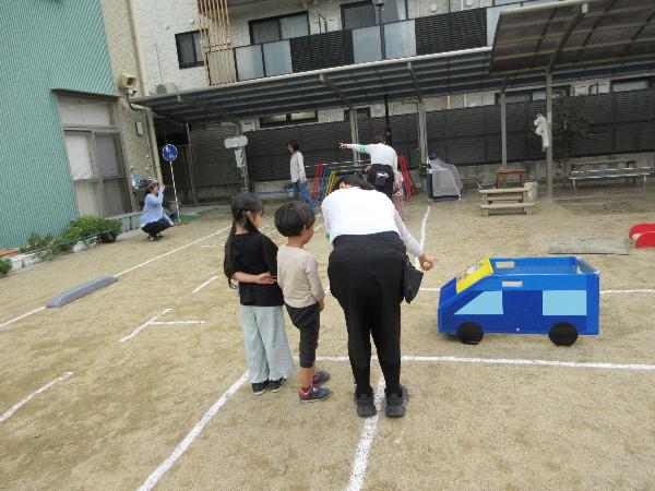パネル絵やDVD鑑賞をして交通ルールを学びました。また、保護者向けの交通安全教室を行いました。園庭に作った模擬道路では保護者の方と手をつなぎ、歩行訓練をしました。降園時には門から道路に飛び出さず、保護者と手をつなぎ、しっかり止まって安全確認を行いました。