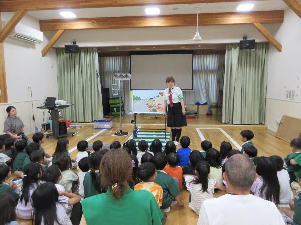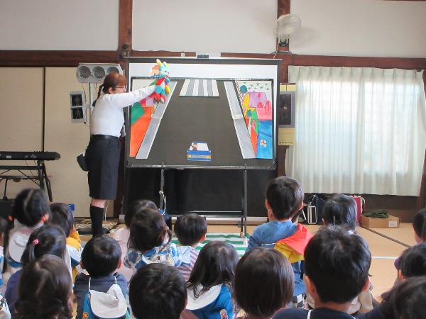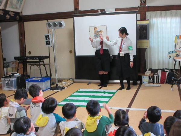 大津市では、保育園や幼稚園等に出向き、幼児とその保護者等を対象として「交通安全カンガルー教室」を開催し、パネル絵やDVD鑑賞等を通して交通安全教育を行っています。
