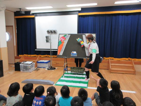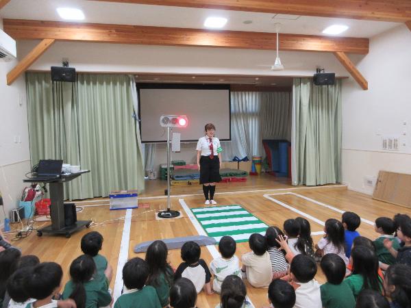 パネル絵やDVD鑑賞で信号のお約束や、道路の歩き方や、飛び出しの危険、道路では遊ばない事などを学びました。そして園庭にできた模擬道路を実際に歩いて練習しました。横断歩道が青になってもすぐには渡らずに、しっかり顔を動かして右・左・右と安全確認を行い渡ることができました。