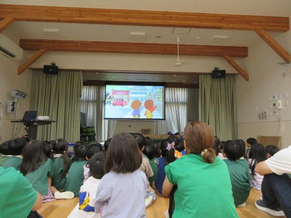 パネル絵やDVD鑑賞で交通ルールを学びました。信号の約束や、道路の歩き方、飛び出しの危険、道路で遊ばないことなどを学びました。そして、実際に園の周辺道路で歩く練習をしました。交差点や駐車場から車やバイク自転車などが出てこないか、周りの安全をしっかり確認して歩く事ができました。
