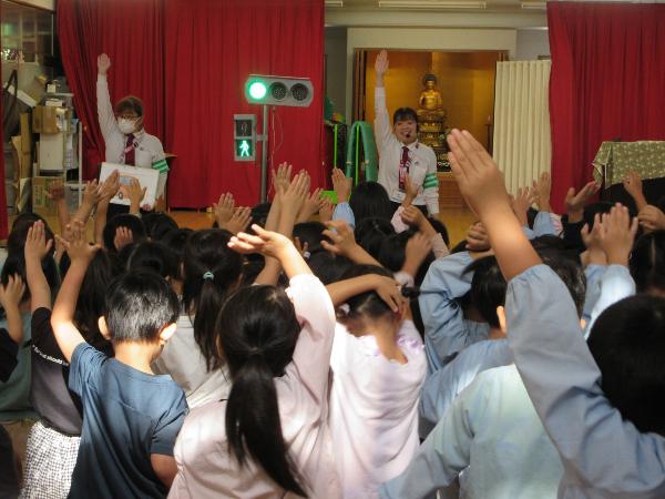 パネル絵やDVD鑑賞で、信号の約束や、道路の歩き方、横断歩道の渡り方などを学びました。そして、ホールに模擬道路を作り、実際に歩いて練習しました。横断歩道を渡る時だけではなく、信号がない交差点を渡る時にも、しっかり顔を動かして右・左・右の安全確認を行う事ができました。