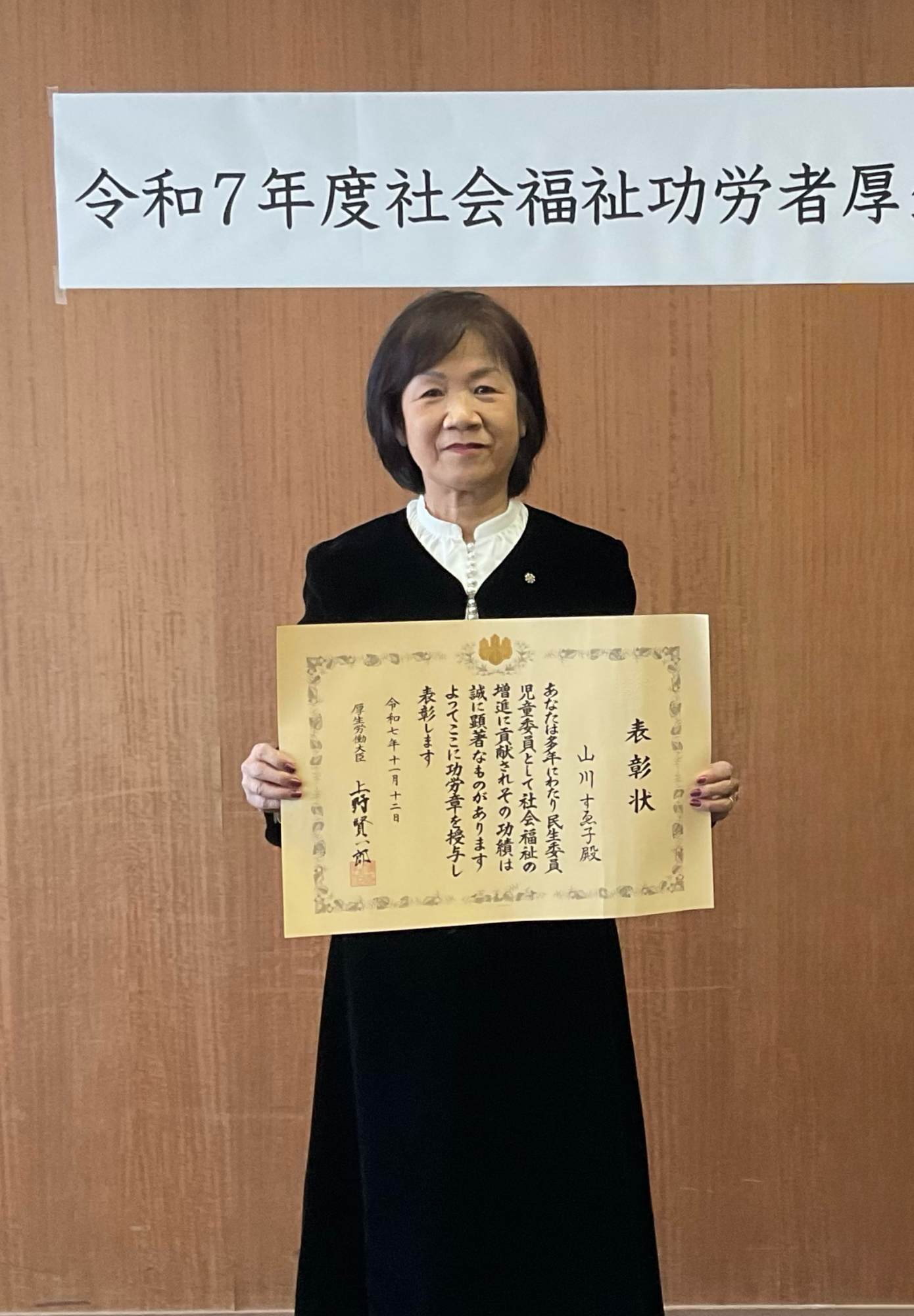 民生委員児童委員であって、20年以上職務に精励し、その功績が特に顕著であると認められるものに対して、厚生労働大臣から感謝状が授与されます。
