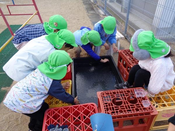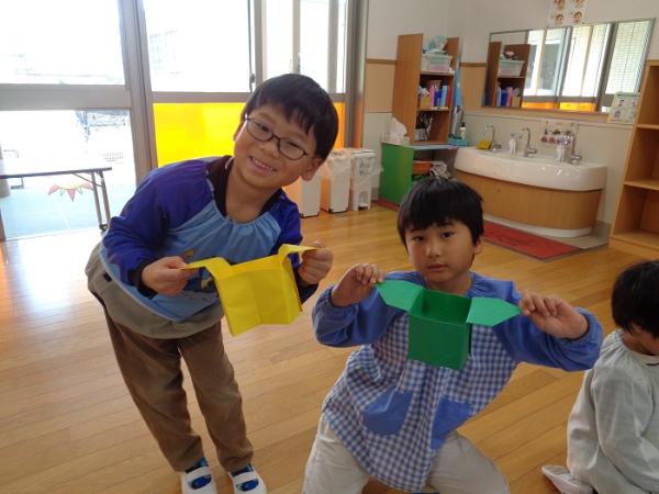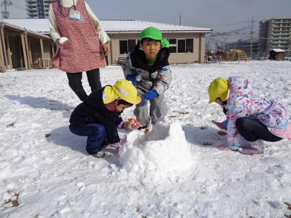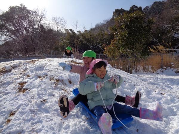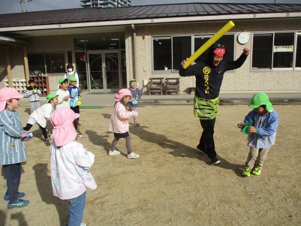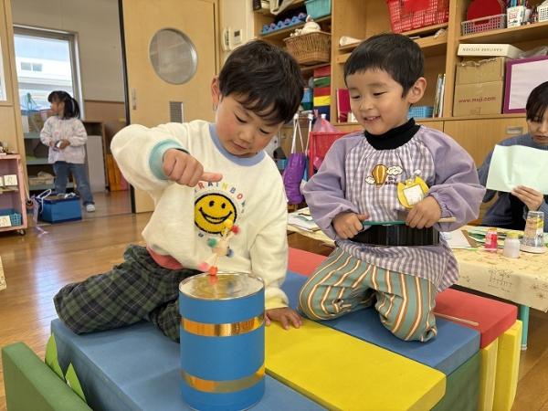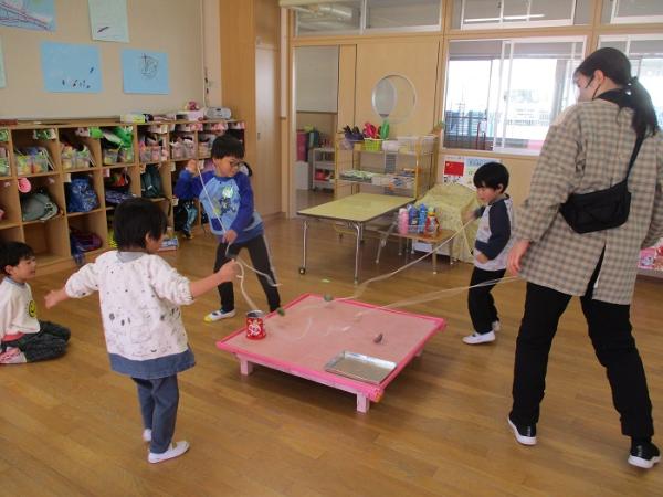 大津市立逢坂幼稚園 日々のアルバム 更新日:2026年02月18日 5歳児が誰が最後までコマが回るか、コマ対決をしています。真剣勝負です。 4歳児は紙コップのけん玉をタイミングよく入れるように何度もチャレンジしています。 3歳児は色々なコマの回し方を楽しんでいます。友達もワクワクしながら見ています。 幼稚園の築山に雪が積もり、ソリ遊びを始めた子ども達。登っては滑ってを繰り返し楽しんでいました。 雪を集めてはくっつけて、3歳児がすっぽり入れるぐらいのかわいいおうちをつくっていました。 投げて、逃げて、その間に雪を丸めて、大忙しですが、園庭中を走り回って元気に雪合戦を楽しんでいました。 2月3日の節分に豆まきをしようと折り紙や画用紙で三方をつくりました。 打出中学校の教頭先生が七輪で豆を炒って、子ども達と一緒に豆まきをしてくださいました。鬼は外!福は内!の声が園庭に響きました! 節分の行事にちなんで、宅配給食をみんなで食べました。鬼のカマボコを食べて「鬼を食べてやっつける!」と言っていた子どもたちでした。 寒い日に、子ども達が大きな容器に水をいれました。すると翌日には、上に乗っても割れないほどの氷ができました。 氷に興味をもった5歳児が小学校の先生に授業をしてもらいました。自分でつくったノートにメモを取りながら興味津々で聞いていました。 図書館司書の方をお招きして子ども達に絵本の読み聞かせをしていただきました。谷川俊太郎さんの「とっきっき」を覚えて、一緒に楽しむ子どもたちでした。 お正月明け、おせち料理をつくったり、食べたりしてごっこを遊びを楽しんでいます。 PTAさん主催で親子ふれあい活動をしました。腹話術やギターに合わせて歌ったり、ゲーム遊びをしたりして楽しみました。 小学校の校長先生が5歳児の子どもたちに書初め体験をしてくださいました。大きな紙と筆で元気いっぱいに書きました。 3歳児が新年を迎えるにあたり、使っていたオモチャをスポンジで洗ってきれいにしていました。 中学校の先生が子どもたちとボール遊びをしにきてくれました。寒くても元気いっぱいです。 今年もサンタさんがやってきて子ども達に素敵なプレゼントを手渡しもらい、大喜びの子ども達でした。 京阪電車にのってみんなで動物園に行きました 3歳児が電車を箱でつくりました。早速、出発です。 小学校の先生が作品展にきてくれました。回転ずしを食べてもらい大喜びでした。 この記事に関するお問い合わせ先 教育委員会 逢坂幼稚園〒520-0053 大津市音羽台6-2電話番号:077-522-2247ファックス番号:077-522-2247逢坂幼稚園にメールを送る